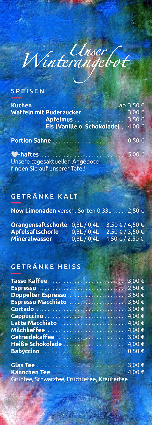 Das Kuchenangebot ist vielfältig und aus eigener Herstellung. Natürlich gibt es auch feine Kräutertees, erfrischende Limonaden, schmackhaftes Eis und herzhaft Pikantes.